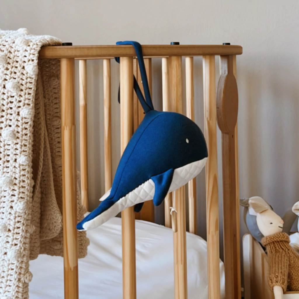 La Ballenita Franca es musical, de tela color azul nórdico suave, de 10x15 cm de tamaño aprox. y tiene cinta para colgar. Se entrega con una dedicatoria: