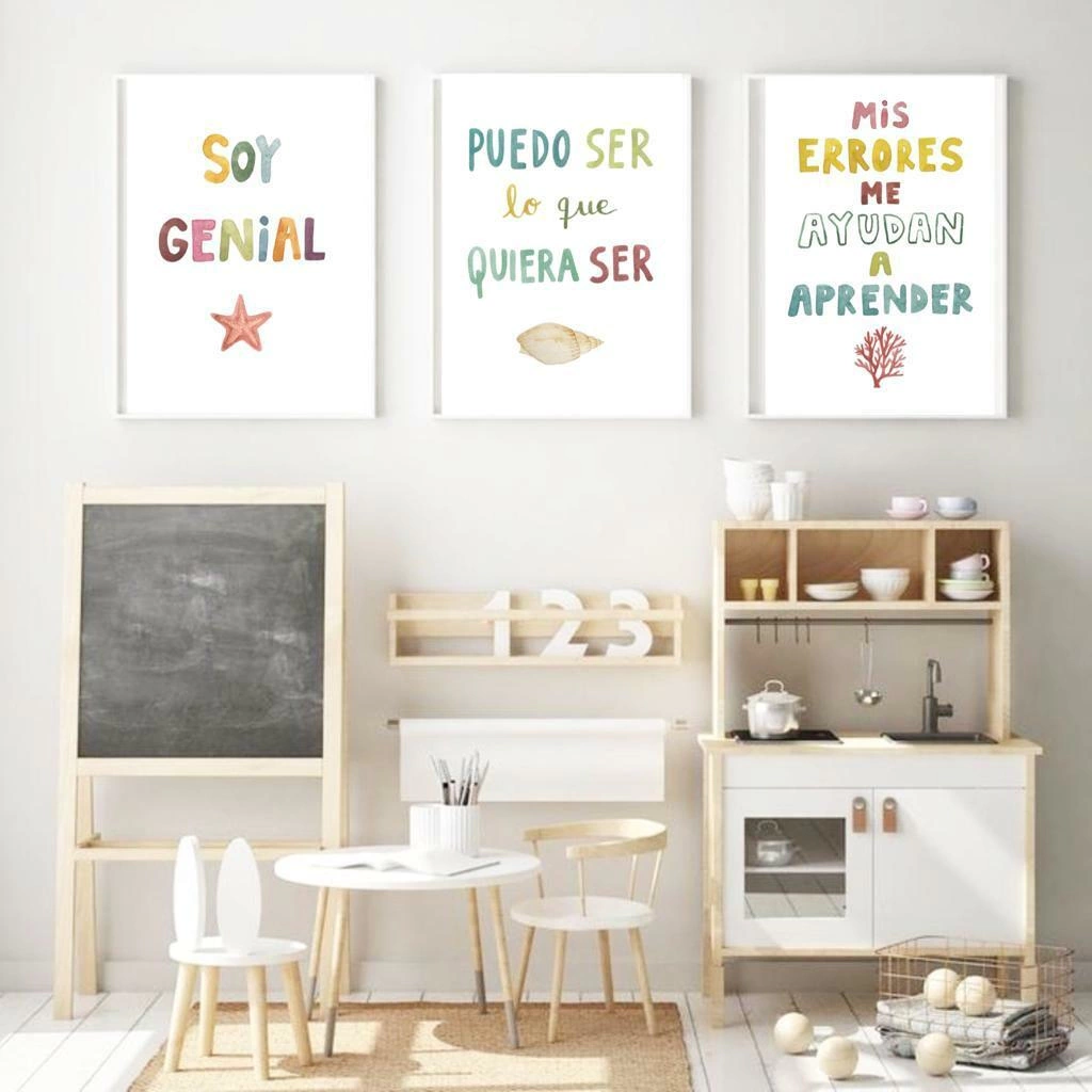 Cada lámina combina afirmaciones positivas con ilustraciones en acuarela inspiradas en el mundo playero: tonos arena, sol suave, caracoles, olas y elementos que evocan calma y alegría. Una forma simple y poderosa de llenar los espacios infantiles con mensajes que nutren la autoestima.